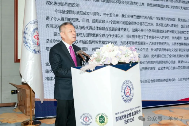 仪式环节,国际武联副主席吴廷贵致辞祝贺恒源祥集团和国际武联的合作持续深化,十余载岁月间恒源祥的身影始终与武术国际化进程紧密相连,共同推动武术实现从竞技赛场走向大众生活、从体育项目升华为文化符号的深刻转变。希望在新的合作周期,双方为世界武术运动的繁荣发展谱写新的篇章。