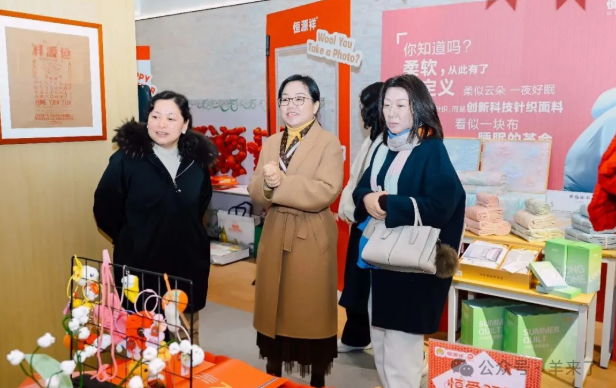 步入小店,浓郁的海派风情与喜庆氛围扑面而来。大红色的“人人福禄寿,家家恒源祥”窗花映照着玻璃,传递着品牌对千家万户的美好祝愿;店内随处可见的精致绒线花艺术品,装点出温暖优雅的空间,更体现了恒源祥对美学经济的深耕与探索。顾红蕾书记向领导与嘉宾们详细介绍了本次快闪店的亮点产品:从传承百年的经典绒线,到斩获“全国纺织创新产品”称号的“奈特棉”春夏床上用品;从泰国纯天然乳胶打造的彩羊乳胶枕,到精选羊毛制成的春季服饰,以及内衣精品……每一件产品都诠释着品牌的匠心与创新。