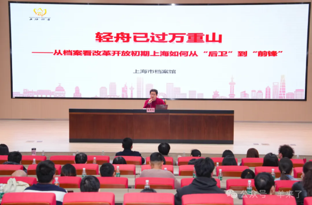 在“跟着档案学党史——档案文献党课”党课环节,上海市档案馆史料编研部陆闻天老师为党员们讲述了《从档案看改革开放初期上海如何从“后卫”到“前锋”》的专题党课,通过档案文献阐明了上海如何转变发展思路,依托开发开放的路径,逐步成长为“改革开放排头兵、创新发展先行者”,谱写了中国式现代化的上海发展新篇章。