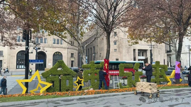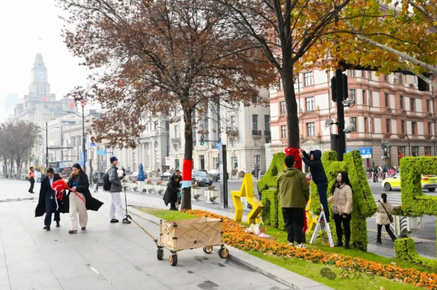 元旦期间,外滩客流澎湃,游客们惊喜地发现外滩、中山东一路沿线被暖意包裹,行道树穿上了专属“毛衣”,迎接新年。