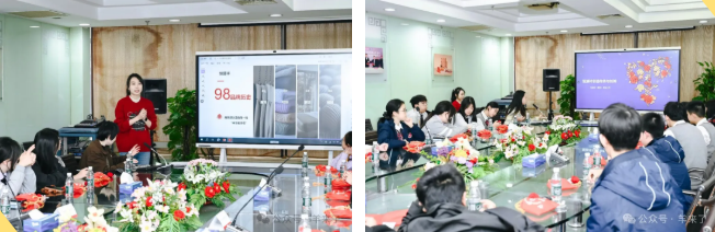 师生代表们首先参观了恒源祥文化艺术展厅,集团党办主任吴仕佳、团委书记刘志远介绍了百年品牌历史与发展、奥运故事以及公益和非遗项目。