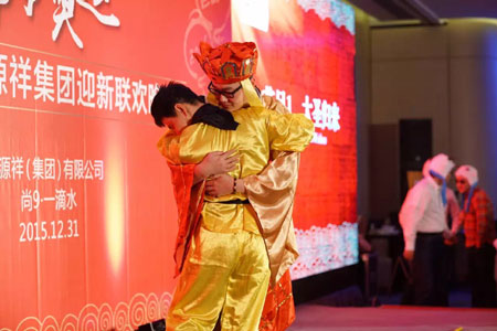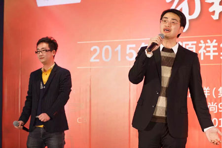 2015年是恒源祥的本命年,也是中国人民纪念抗日战争暨世界反法西斯战争胜利70周年。恒源祥原创音乐剧《犹太人在上海》得到了社会各界的好评,被誉为“高雅与市井、情感与理智、音乐与戏剧高度融合的集大成之作”。该剧与2013《永远的尹雪艳》、2014《大商海》一起组成了“上海三部曲”。年会一开场,《大商海》里的“说书人”——范林元老师用精彩的评弹向大家讲述了“三部曲”的故事,接着演员代表们演唱了充满温馨大家庭感觉的《大饼油条》。